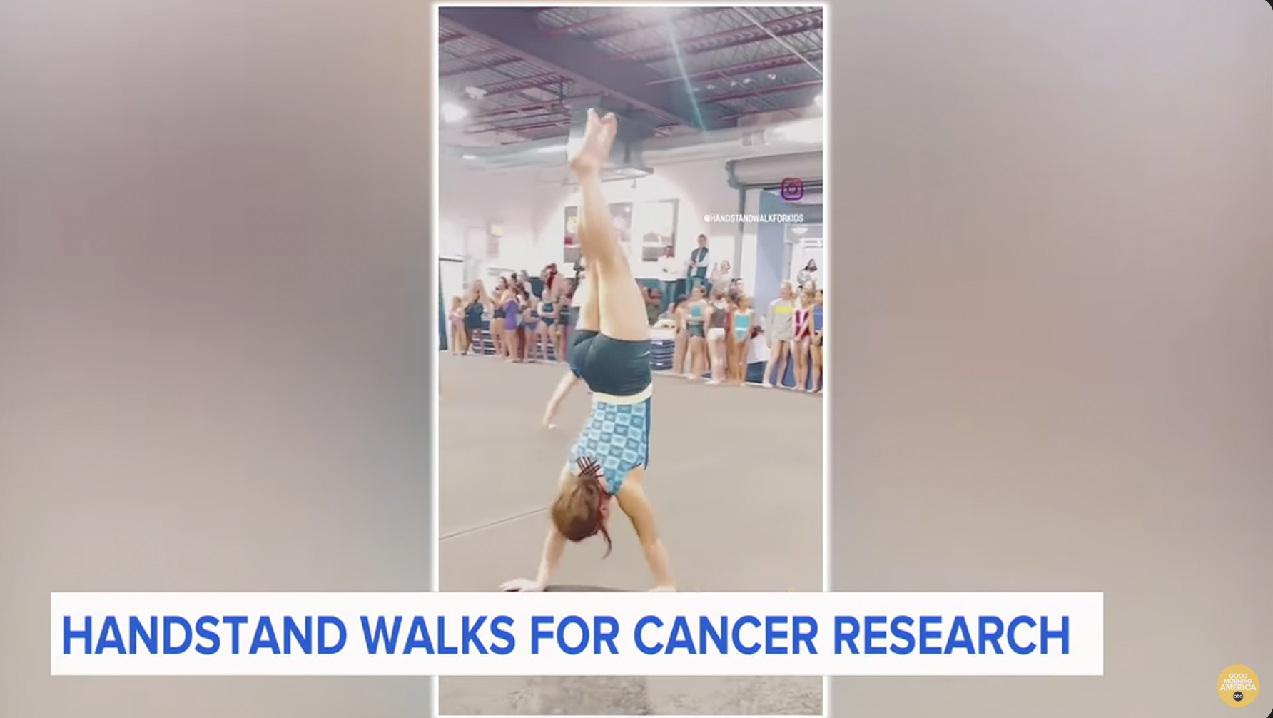 This inspiring video highlights Handstand Walk for Kids, showing young gymnasts raising funds for pediatric cancer research through handstand-walk challenges. The segment notes the initiative has surpassed $1 million raised over the last five years, amplifying awareness and inviting more gyms and families to get involved.
